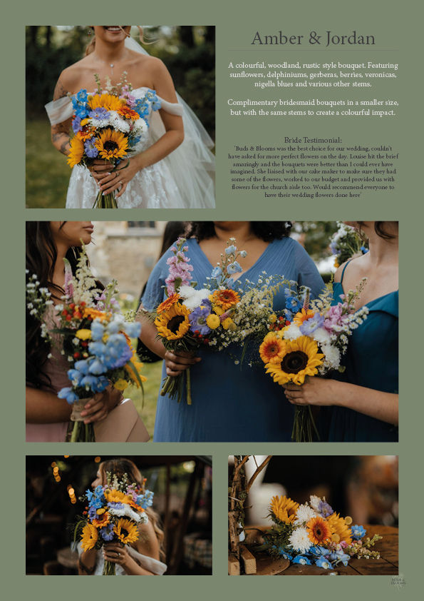 A vibrant, woodland-inspired rustic bouquet bursting with colour and natural charm. Featuring bold sunflowers as the focal point, complemented by delicate delphiniums, cheerful gerberas, seasonal berries, veronicas, and striking nigella blues.